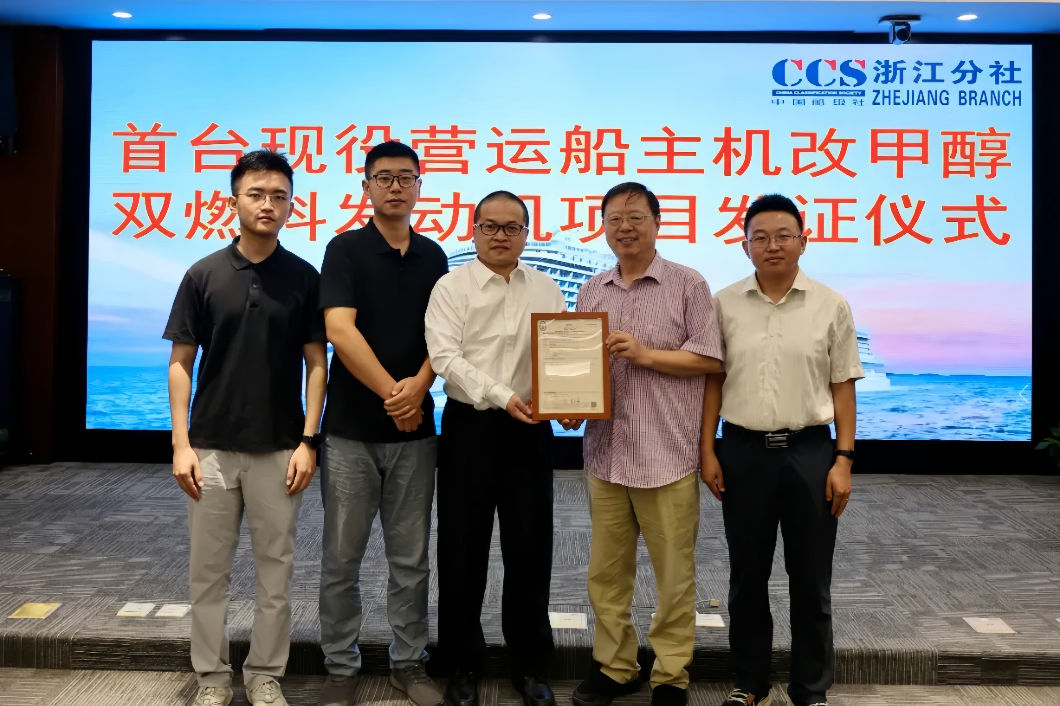 浙能邁領“領先1”輪主機獲頒首臺現役營運船主機改裝為甲醇雙燃料發動機項目證書。 中國船級社浙江分社 提供