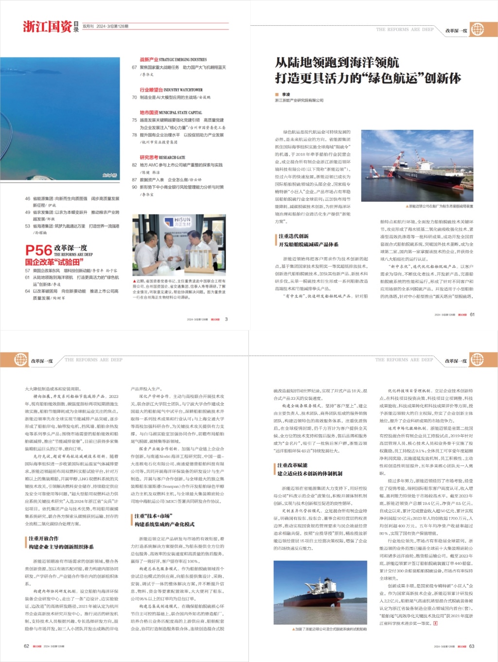 綠色航運是現(xiàn)代航運業(yè)可持續(xù)發(fā)展的必然,是未來航運業(yè)的方向。省能源集團抓住國際海事組織實施全球海域“限硫令”的機遇,于2018年牽手船舶行業(yè)民營企業(yè),成立混合所有制企業(yè)浙江浙能邁領環(huán)境科技有限公司(以下簡稱“浙能邁領”)。經過六年的快速發(fā)展,浙能邁領已成長為國際船舶脫硫領域的頭部企業(yè)、國家級專精特新“小巨人”企業(yè),產品市場占有率穩(wěn)居船舶脫硫行業(yè)全球前列;正加快布局節(jié)能降耗、減碳脫碳技術創(chuàng)新,為世界海洋環(huán)境治理和船舶行業(yè)清潔化生產提供“浙能方案”。