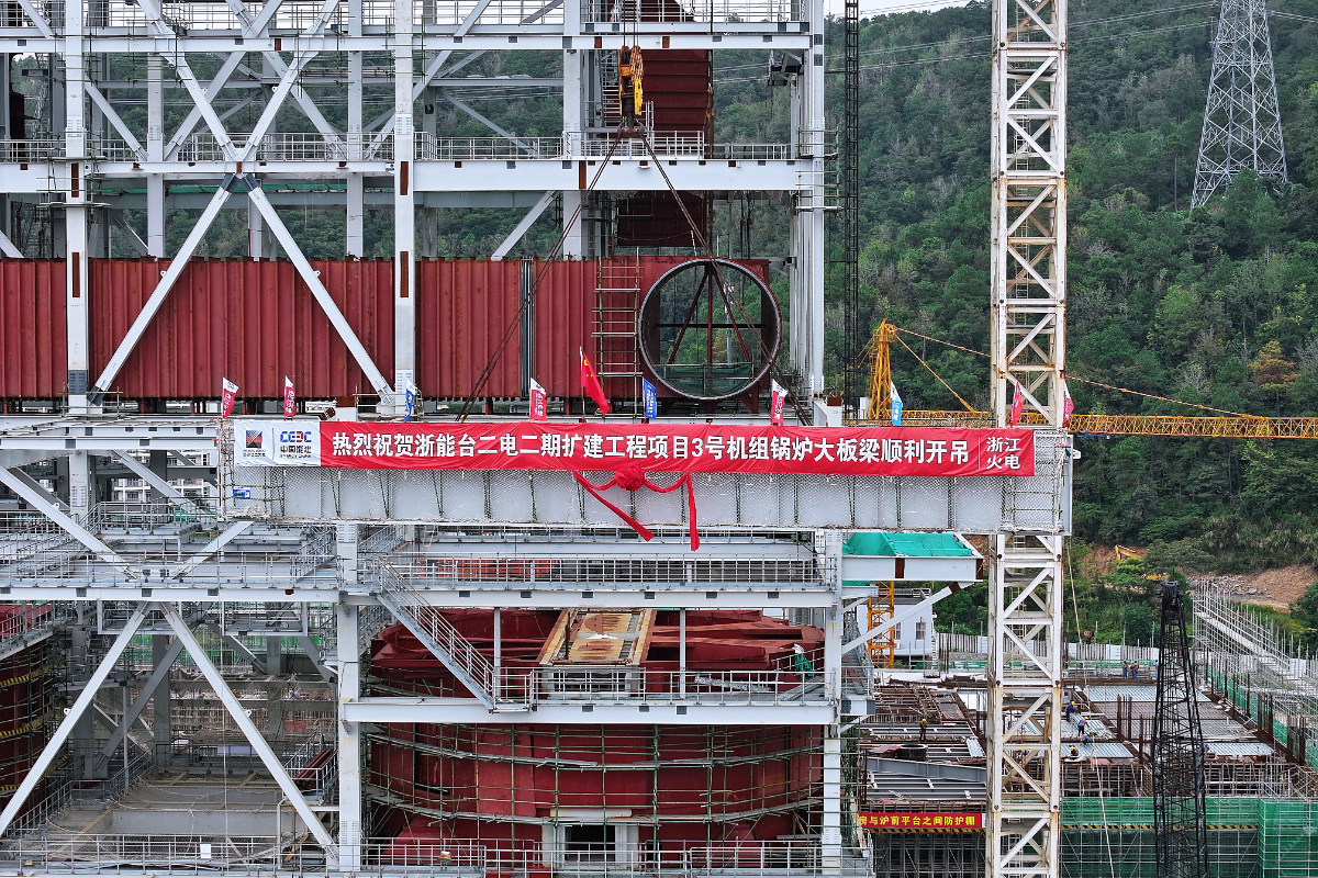 臺二電二期3號鍋爐首根大板梁吊裝就位。 俞琬 提供