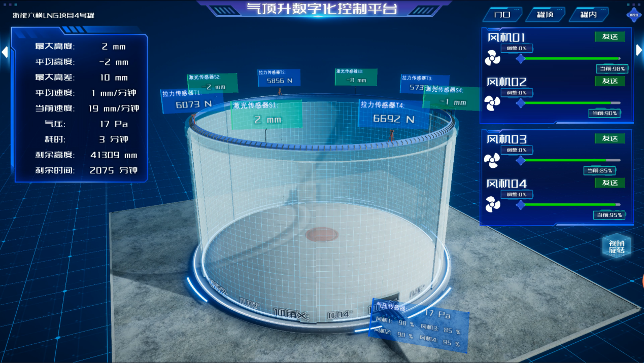 浙能六橫LNG項目共建4座儲罐,每座儲罐穹頂重達千噸,氣頂升上升高度相當(dāng)于“爬”上14層樓。為確保穹頂升起均衡平穩(wěn),項目使用了數(shù)智化頂升系統(tǒng),通過密布罐體的傳感器實時監(jiān)控頂升數(shù)據(jù),結(jié)合三維可視化智控,大幅減少了人工操作帶來的誤差,讓氣頂升的過程變得精準、智能、安全。