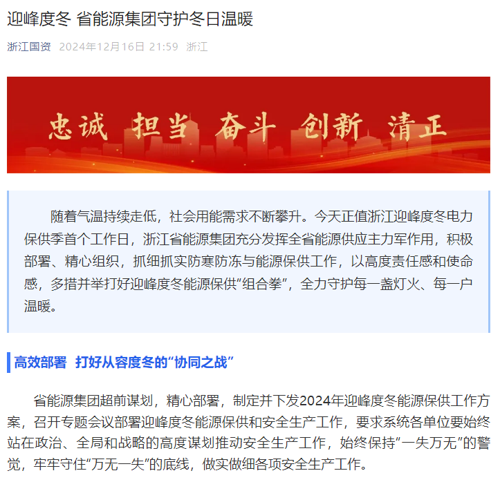 浙能集團系統各單位已經全面吹響了迎峰度冬的“集結號”,戮力同心、全力做好迎峰度冬能源保供工作,筑牢防寒防凍安全網,以實效彰顯擔當,以實際行動書寫著冬日里的溫暖篇章,守護千家萬戶的溫暖與光明。