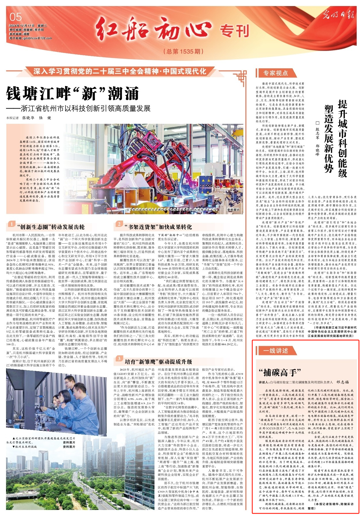 編者按 煤炭的高效清潔利用對促進能源綠色低碳轉型具有重要意義。作為煤炭集中利用的主體,在燃煤電廠開展二氧化碳捕集和利用,對于降低碳排放具有重要的示范價值。12月17日,《光明日報》于“紅船初心專刊”發布報道,邀請白馬湖實驗室二氧化碳捕集及利用團隊負責人祁志福立足一線工作,講述實驗室里的“捕碳高手”。