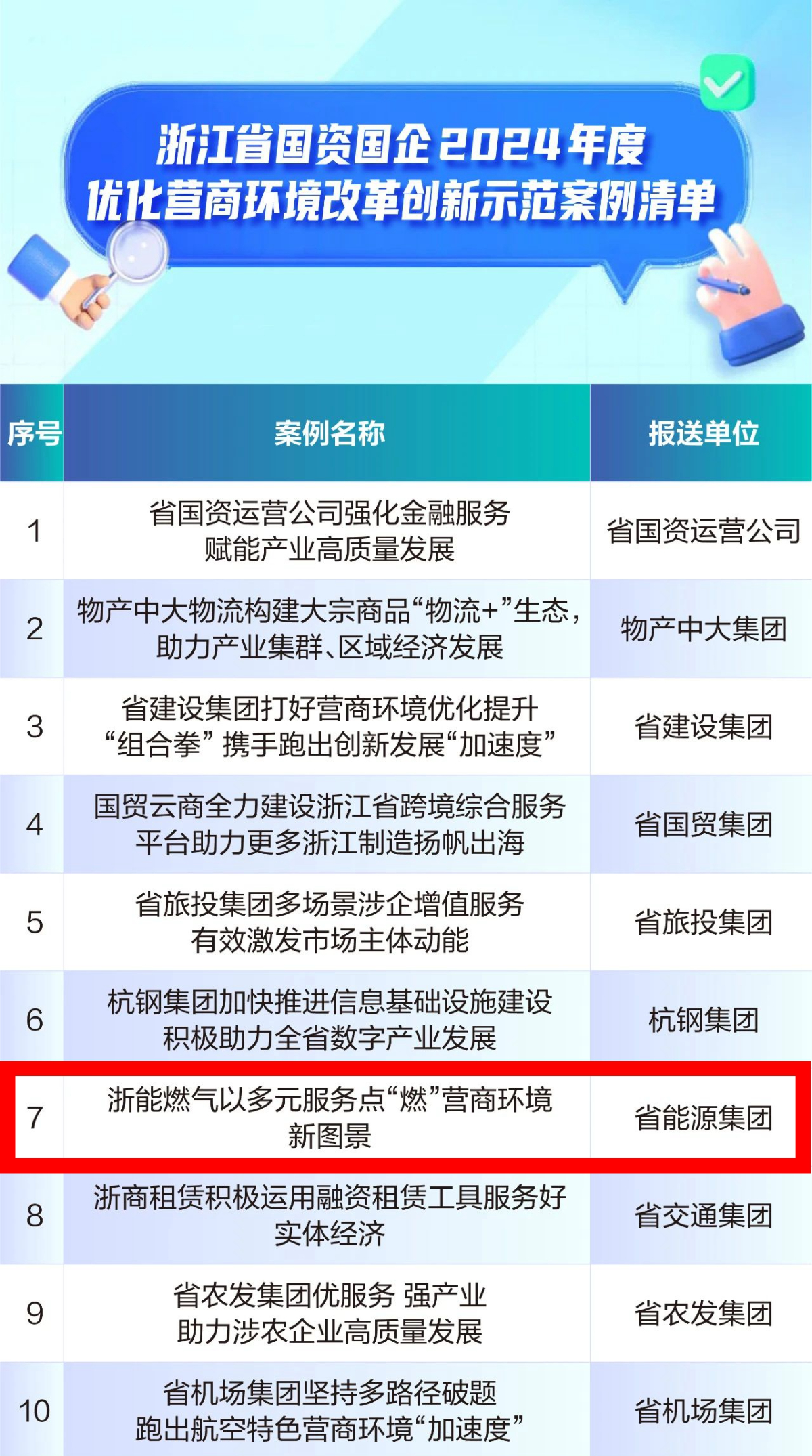 本網訊 近日,浙江省國資國企2024年度優化營商環境改革創新示范案例發布,公布了27個展現浙江特色、具有推廣示范意義的案例。浙能集團報送的“浙能燃氣以多元服務點‘燃’營商環境新圖景”案例成功入圍。