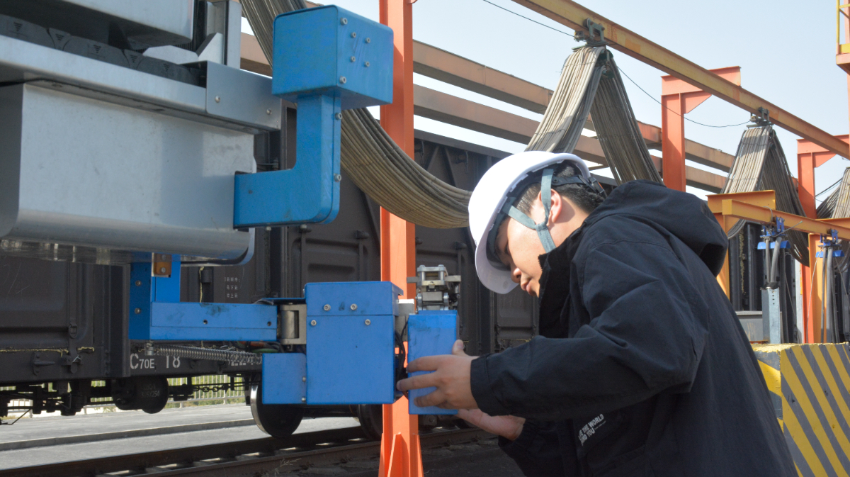 “翻車機(jī)全自動(dòng)智能摘復(fù)鉤機(jī)器人”研發(fā)項(xiàng)目團(tuán)隊(duì)成員現(xiàn)場(chǎng)調(diào)試摘復(fù)鉤機(jī)器人。 駱洲 提供