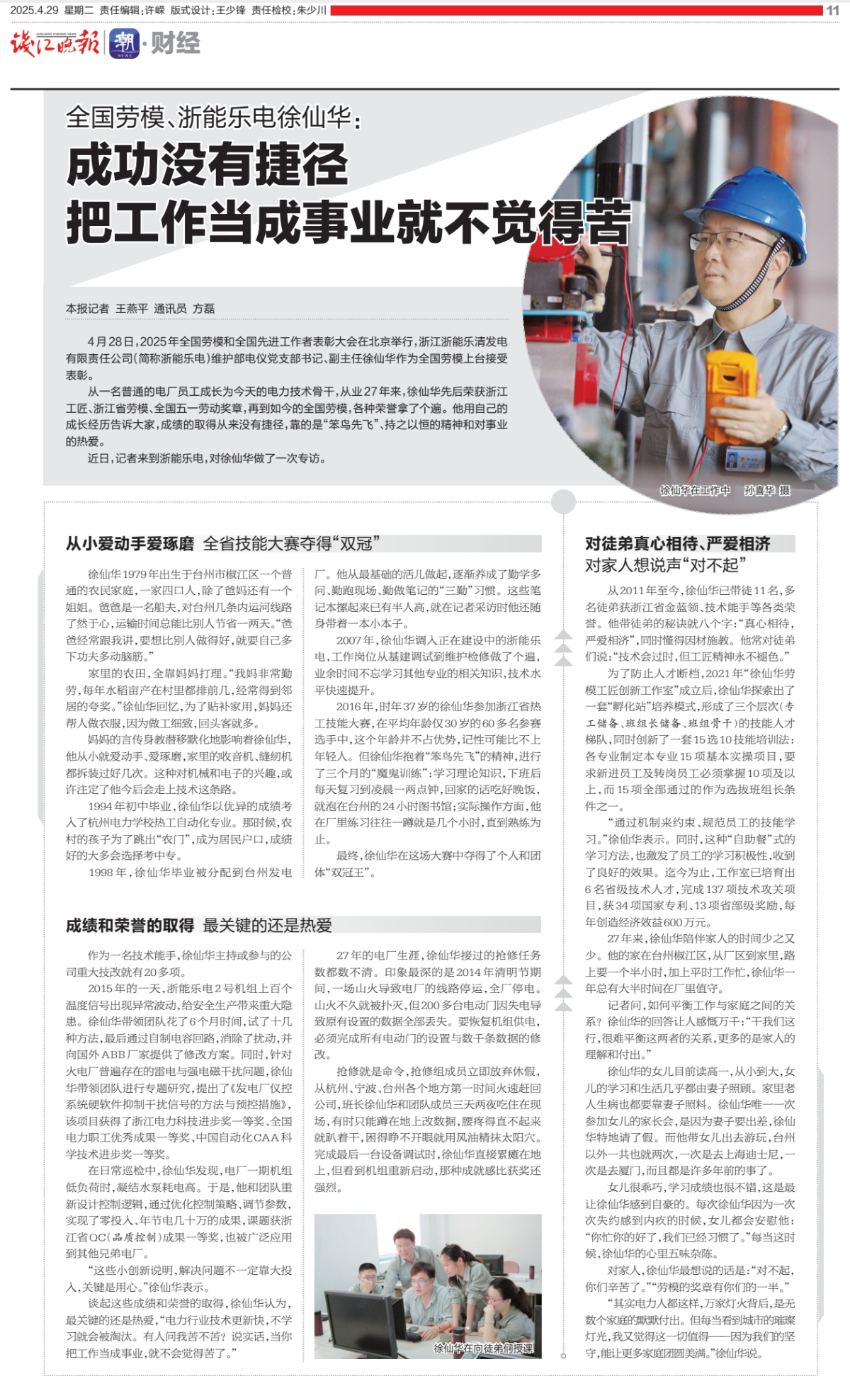 4月29日,錢江晚報報道《全國勞模、浙能樂電徐仙華:成功沒有捷徑,把工作當成事業(yè)就不會覺得苦》。 錢江晚報 提供