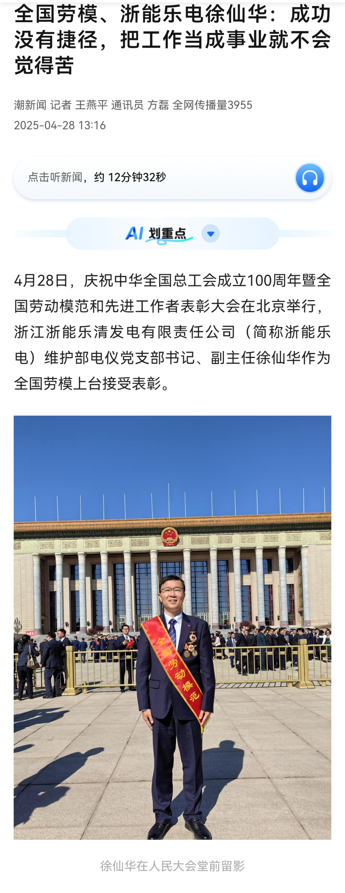 4月28日,潮新聞報道《全國勞模、浙能樂電徐仙華:成功沒有捷徑,把工作當成事業(yè)就不會覺得苦》。 潮新聞 提供